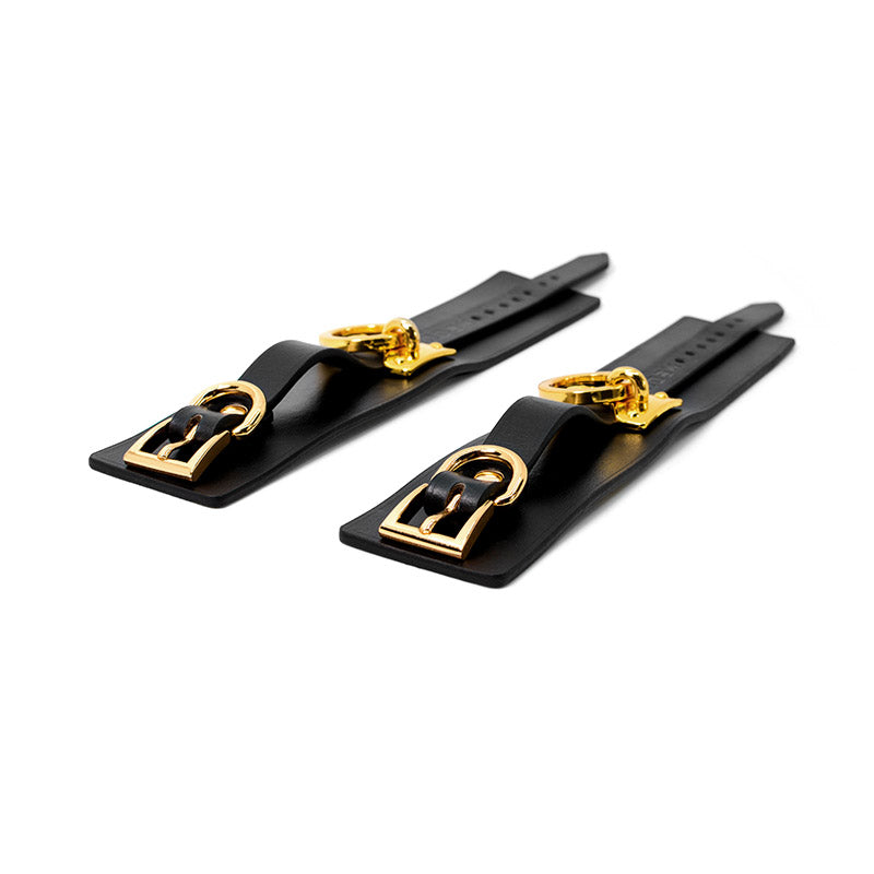 3. Link the two thigh cuffs end to end to form a circle, linking the bent legs tightly. This is a test of body flexibility and a sense of confidence. In addition, connected to the belt by a double-ended clip, the rings respond to the body. The aesthetic impression generated during the process would greatly enhance the experience of having fun. When you lie low with your legs bent and the exquisite double-ended clip linked to the thigh cuffs, the private part of the body is exposed, making it physically and mentally ready for sincere communication and combination.